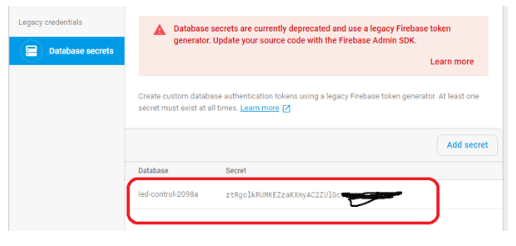在點擊數(shù)據(jù)庫秘密你會發(fā)現(xiàn)一個秘密密鑰,復(fù)制這個密鑰并保存在記事本中,這是你的firebase授權(quán)密鑰,你以后會需要。