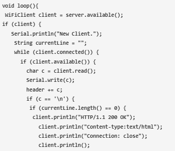 在loop()函數(shù)中,您必須編寫當(dāng)新客戶端與web服務(wù)器建立連接時(shí)發(fā)生的事情。ESP32總是使用server.available()偵聽傳入的客戶端;并將輸入的數(shù)據(jù)存儲(chǔ)到一個(gè)字符串變量中,并在串行監(jiān)視器上打印數(shù)據(jù)。