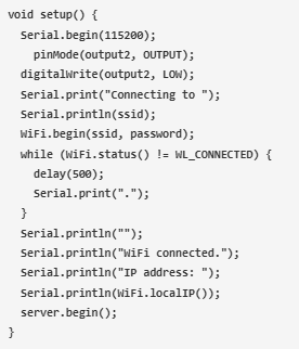 在void setup()函數(shù)中,我們將初始化波特率,LED輸出,并使用WiFi.begin(ssid,password)將模塊與Wi-Fi連接;函數(shù)。該功能啟動(dòng)Wi-Fi連接,等待連接成功,并在串口監(jiān)視器上打印ESP IP地址。