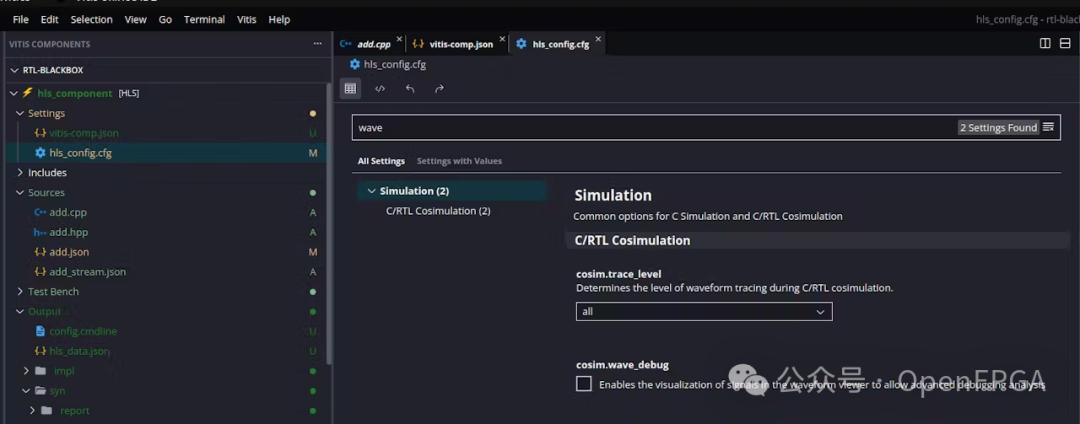 單擊 hls_config.cfg 文件,在 Vitis GUI 的幫助下將 cosim.trace_level 更改為全部并運行聯(lián)合仿真。