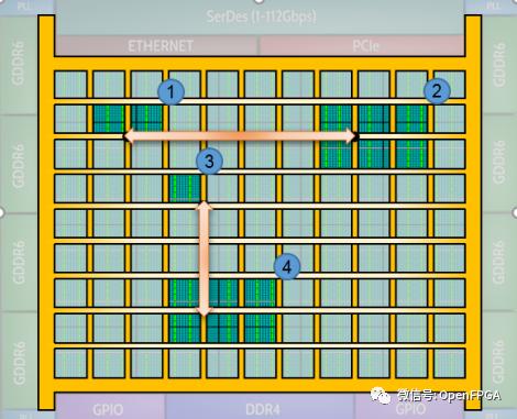 據(jù)介紹,該FPGA不僅在架構(gòu)上使用NoC,通道上也是使用了標準AXi通道(每一行或每一列都有兩個 256 位的、單向的、行業(yè)標準的 AXI 通道),該通道可以在每個方向上以 512Gbps(256bit x 2GHz)的傳輸速率運行。