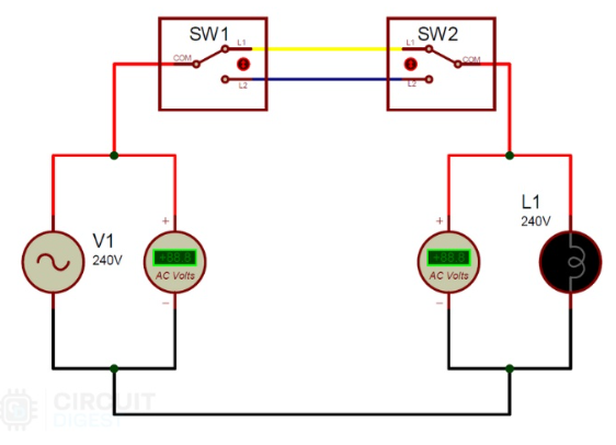 年輕的工程師在實(shí)驗(yàn)室里學(xué)到的一個(gè)簡(jiǎn)單而有趣的連接圖是樓梯照明的設(shè)置。也許我們大多數(shù)人可能已經(jīng)使用過(guò)它,而不太關(guān)注它是如何工作的。就這一點(diǎn)而言,家里或任何其他地方的樓梯照明通常是用一種叫做雙向開(kāi)關(guān)的東西來(lái)完成的。