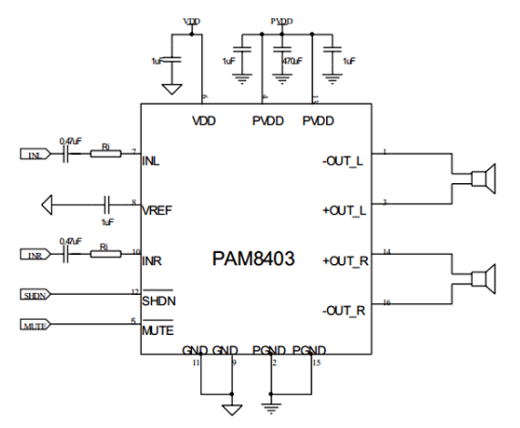 GND音頻輸入信號的接地引腳。連接到音頻源的接地基準(zhǔn)。