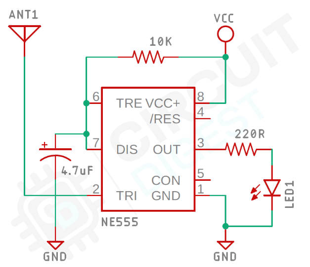 555定時(shí)器是許多不同應(yīng)用中最常用的IC,這就是電路的工作非常簡單,當(dāng)引腳2的電壓低于VCC的1 / 3時(shí),555定時(shí)器的輸出引腳變高,LED亮起,當(dāng)其高于1 / 3 VCC時(shí),輸出變低,LED關(guān)閉。當(dāng)天線檢測到交流輸入時(shí),輸出變?yōu)楦唠娖胶偷碗娖?,LED相應(yīng)閃爍。