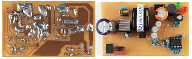 為了方便和測試,我們制作了一個(gè)手工版的PCB,焊接后的頂部和底部如圖所示。