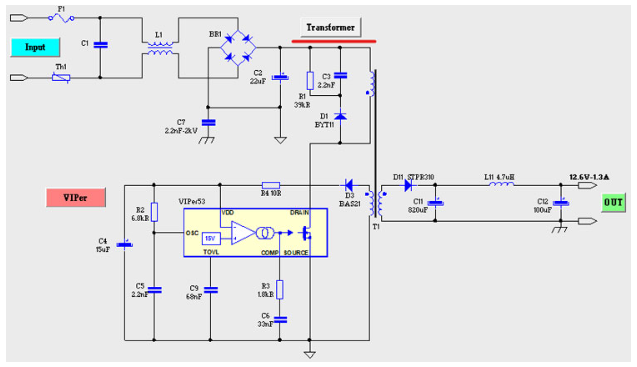 我們開始使用Viper的電源設(shè)計(jì)軟件來設(shè)計(jì)電路。您可以下載VIPer Design Software Version 2.24。你需要明確這個(gè)版本,因?yàn)镾T最新版本的軟件不支持viper22A IC,通過選擇輸入輸出規(guī)格,可以生成完整的電源電路。完整的電路為基于viper22的CC/CV電池充電器如下所示。