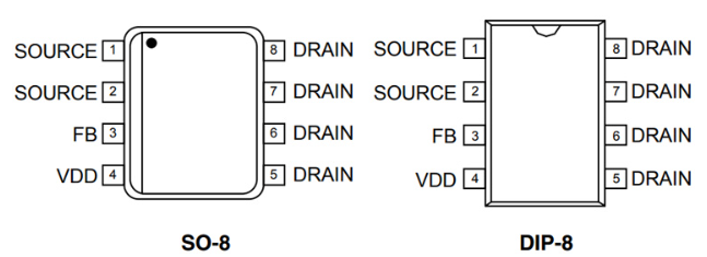 在上圖中,顯示了Viper22A IC的典型功率能力。如您所見,輸入電壓為195-265V的DIP-8版本IC可以提供20W的功率。Viper22A IC的引腳如下所示。