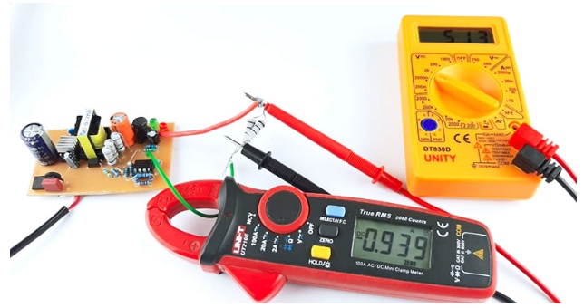 為了測試電路,我們有如下所示的測試設(shè)置。為了測量輸出電壓,我們使用萬用表,為了測量電流,我們使用鉗形表。