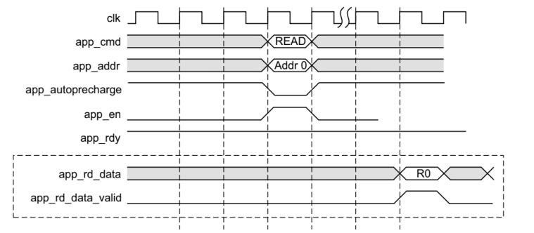 DDR4 的讀或者寫都包含寫命令操作,其中寫操作命令(app_cmd)的值等于 0,讀操作 app_cmd 的值等于 1。首先來看寫命令時序,如下圖所示。首先檢查 app_rdy,為高則表明此時 IP 核命令接收處于準(zhǔn)備好狀態(tài),可以接收用戶命令,在當(dāng)前時鐘拉高 app_en,同時發(fā)送命令(app_cmd)和地址(app_addr),此時命令和地址被寫入。