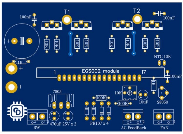 這是我做的PCB,以及使用的元件。您可以看到組件的數(shù)量是最少的。輸入是通過一個高規(guī)格的電線,以減少電壓下降,由于導(dǎo)體的電阻。在輸入端增加一個2200uf的槽電容。EGS002模塊的5V是通過LM7805穩(wěn)壓器和濾波電容產(chǎn)生的。如前所述,交流反饋電路包括一個由四個FR207二極管組成的橋式二極管,一個由兩個100kohm電阻和一個10kohm預(yù)設(shè)定組成的分壓器和一個10uF值的濾波電容器。
