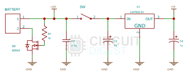電源部分由基于N溝道MOSFET和LM7805穩(wěn)壓器的反極性保護以及一些濾波電容器組成。從電池的輸入連接到電源輸入,然后正極直接連接到開關(guān)和h橋。負極通過N溝道MOSFET連接,用于反極性保護。LM7805為EGS002模塊產(chǎn)生所需的5V。