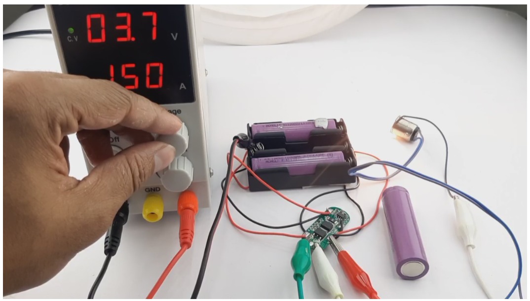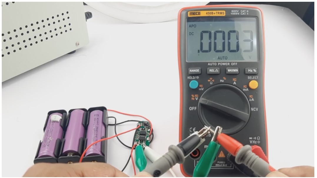 為此,我們將萬(wàn)用表與BMS模塊的輸出連接起來(lái),正如您所看到的,當(dāng)我們用萬(wàn)用表探頭短路模塊的輸出時(shí),電壓變?yōu)榱?,您看不到任何著火的東西。這表明短路安全機(jī)制工作正常。