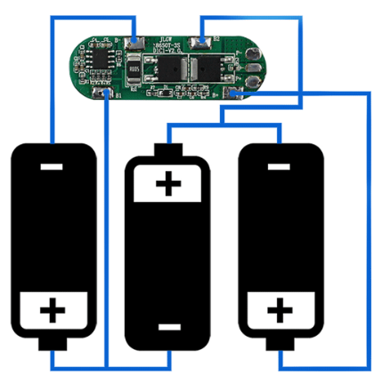 BMS模塊有4個(gè)端子,將連接到電池組的四個(gè)不同點(diǎn)。這樣,BMS模塊可以分別監(jiān)控三個(gè)單獨(dú)的電池,并保護(hù)它們免受過(guò)充或過(guò)放電。BMS的原理圖如下所示。