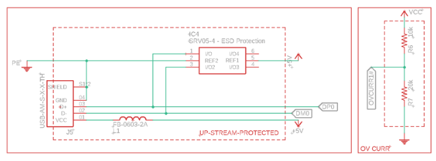 這是USB的輸入。它有一個男性USB插座,將插入到PC,筆記本電腦,或具有USB集線器功能的設(shè)備。還有一個正在使用的ESD保護,具有IC4,將保護該上游端口免受ESD影響。