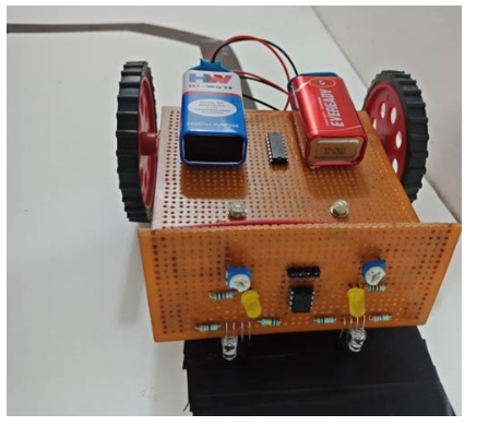 為了給機(jī)器人供電,鋰離子電池(如18650)和升壓轉(zhuǎn)換器(將3.7V轉(zhuǎn)換為5V)是首選,因?yàn)楹?jiǎn)單的9V電池?zé)o法運(yùn)行機(jī)器人。但是使用18650時(shí),還需要包括充電電路,這使得電路有點(diǎn)復(fù)雜。因此,我們?cè)谶@里使用兩個(gè)9V電池并聯(lián)組合。單個(gè)9V電池不會(huì)輸出足夠的功率來(lái)驅(qū)動(dòng)電機(jī)和紅外電路;因此,必須使用并行組合。L293D和IC 358都可以接受高達(dá)9V的輸入電壓,因此在這里使用它。如果電路使用高于9V的電源,請(qǐng)檢查L(zhǎng)293D和IC 358的輸入電壓數(shù)據(jù)表(因?yàn)楦叩碾妷嚎赡軙?huì)損壞IC)。