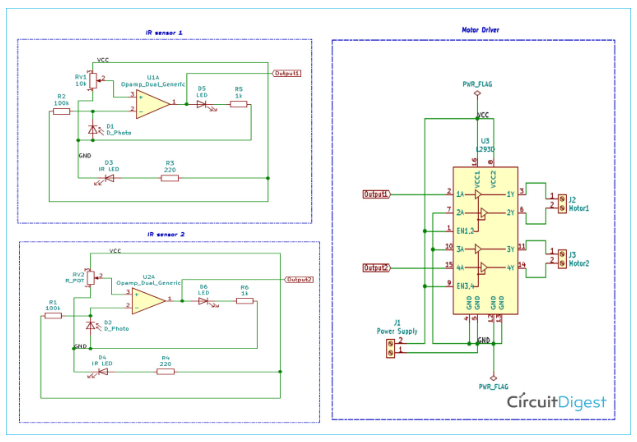 使用L293D和IR傳感器的Line Follower機(jī)器人的完整原理圖如下: