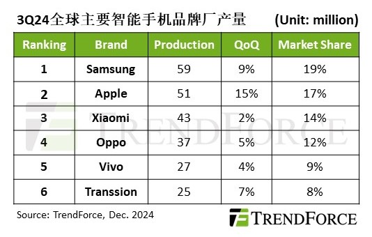 TrendForce集邦咨詢: 受銷售旺季和旗艦新機(jī)推動(dòng),3Q24智能手機(jī)產(chǎn)量季增7%