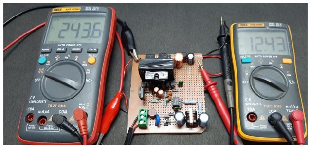 為了測試電路,我們將輸入連接到交流電源,并將輸出連接到萬用表,如您所見,我們有243V作為輸入,12.43V作為輸出。