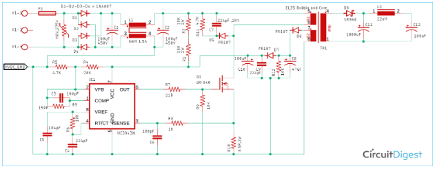 對于這個設(shè)計,UC3843與IRF840 MOSFET一起形成驅(qū)動電路,在初始啟動時需要一些功率來啟動操作,兩個電阻R1和R2出現(xiàn)在那些被稱為啟動電阻,這些啟動電阻提供初始啟動電流來啟動電路,當(dāng)電路開關(guān)時,它在輔助繞組上提供所需的功率。