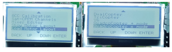 step1:首先按下S4進(jìn)入菜單,然后進(jìn)入負(fù)載電機(jī)布局,然后選擇四軸直升機(jī)X模式,并在X模式下設(shè)置四軸直升機(jī)。檢查這里所有的電機(jī)方向。