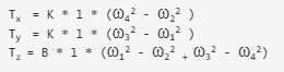 這里有4個(gè)電機(jī),電機(jī)1和3在連續(xù)方向上旋轉(zhuǎn),電機(jī)2和4在連續(xù)方向上旋轉(zhuǎn)。?1、?2、?3、?4分別為電機(jī)1、電機(jī)2、電機(jī)3、電機(jī)4的角速度。l是垂直于表面的Z軸與對(duì)角相對(duì)的電機(jī)之間的距離。
