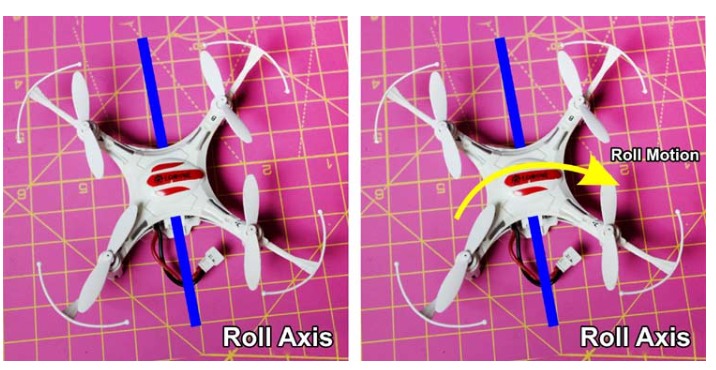 從無(wú)人機(jī)的后面到無(wú)人機(jī)的前面的軸稱為角色軸,圍繞這個(gè)軸的旋轉(zhuǎn)稱為角色運(yùn)動(dòng)。這種運(yùn)動(dòng)也被稱為副翼。在下面的圖像中,我們可以看到滾動(dòng)運(yùn)動(dòng)。