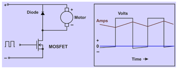 通過(guò)脈沖寬度調(diào)制(PWM),控制器與電機(jī)的開關(guān)連接每秒連接和斷開約2000次。MOSFET晶體管被用作開關(guān)而不是機(jī)械開關(guān)。開關(guān)速度快,電機(jī)無(wú)法檢測(cè)到。如果有24V電池連接,只有一半的時(shí)間,電機(jī)看到電池像12v,以半速運(yùn)行。開關(guān)的速度也會(huì)影響電機(jī)的電感,從而保持電機(jī)電流的持續(xù)流動(dòng)。然而,電流只有一半的時(shí)間從電池流出,所以電池電流將是電機(jī)電流的一半。在下圖中,我們可以看到ESC的內(nèi)部電路圖及其電流(安培)隨時(shí)間的響應(yīng)。