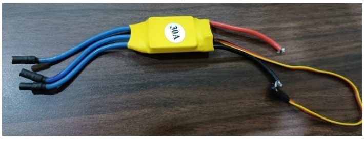 無(wú)刷電機(jī)是三相電機(jī),不能用直流電源操作。ESC連續(xù)產(chǎn)生三個(gè)相位不同但可控的頻率信號(hào),保持電機(jī)轉(zhuǎn)動(dòng)。它有一個(gè)電池輸入和三相輸出的電機(jī)。我們這里使用的是30安培的ECSs。在下面的圖片中,我們可以看到ESC的樣子。我們將為四個(gè)不同的馬達(dá)使用四個(gè)esc。
