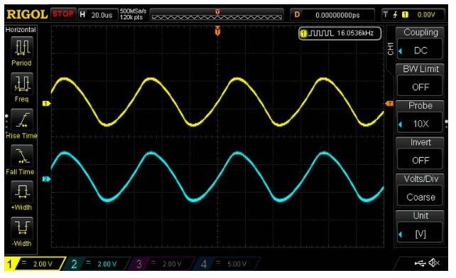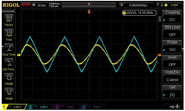 上圖所示的示波器波形說明了輸出(藍色波形)是輸入(黃色波形)振幅的兩倍。
