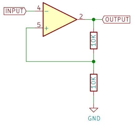 如果我們想要的不是1呢?這可以通過在輸出端添加分壓器并將反相輸入連接到分壓器的中間來實現(xiàn)。非反相輸入照常作為信號輸入。