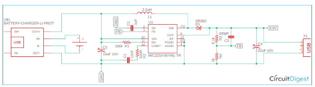 鋰電池在不充電和充滿電的情況下提供3.2V至4.2V輸出。通常,在最佳充電條件下,電池電壓保持在3.7V-4.1V。因此,我們需要某種可以在輸出端提供5.0V的開(kāi)關(guān)穩(wěn)壓器。同時(shí),我們還需要選擇電流范圍為3A的開(kāi)關(guān)穩(wěn)壓器。在這里,我們選擇了開(kāi)關(guān)穩(wěn)壓器MIC2253,這是一個(gè)3.5A開(kāi)關(guān)穩(wěn)壓器,使用1MHz PWM產(chǎn)生輸出電壓。由于開(kāi)關(guān)頻率為1MHz,這為使用更小的電感器提供了可能性,從而可以在很小的尺寸上提供高功率。為了補(bǔ)償電池電壓,它具有2.5V至10V的輸入電壓范圍,這是我們?cè)O(shè)計(jì)要求的理想電壓。