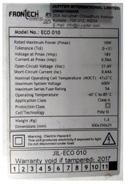 為了測試電路,使用了一個額定電壓為18V .56 a的太陽能電池板。下圖是太陽能電池板的詳細規(guī)格。