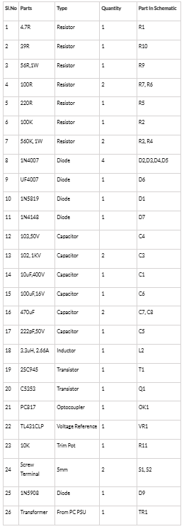為電路構建/采購變壓器是任何SMPS設計中最關鍵的部分,但這種方法通過挽救變壓器完全避免了這一步,如果你像我一樣是一個電子垃圾,它也有一個非常好的學習經(jīng)驗。我的ATX電源打撈后所需的部分如下所示。