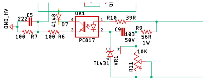 PC817光耦合器OK1與參考電壓VR1和二極管4148形成反饋與控制電路,該部分中的其他電阻僅作為分壓器,限流電阻和濾波電容。除此之外,我還根據(jù)要求添加了電位器R11來修剪電壓。