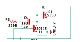 電路中晶體管Q1、C5353為主開關晶體管,T1為輔助開關晶體管。C4和R5構成產(chǎn)生主開關信號的主振蕩器。