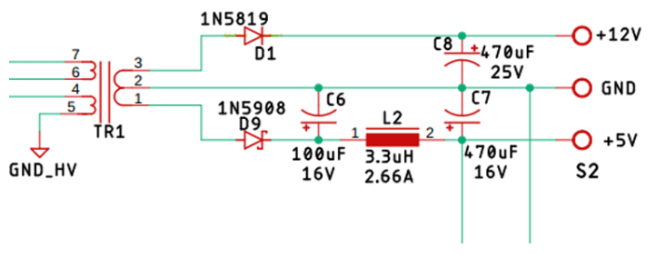 二極管D1和D9是電路的整流二極管。電容C8負責濾波12V,電容C6和C7與L2一起形成輸出部分的PI濾波器。