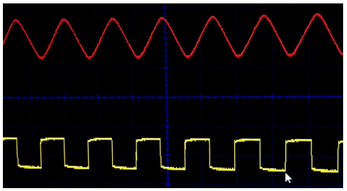輸出可以在示波器上觀察到,下面給出了示波器輸出的快照。輸入方波用黃色表示,輸出正弦波用紅色表示。
