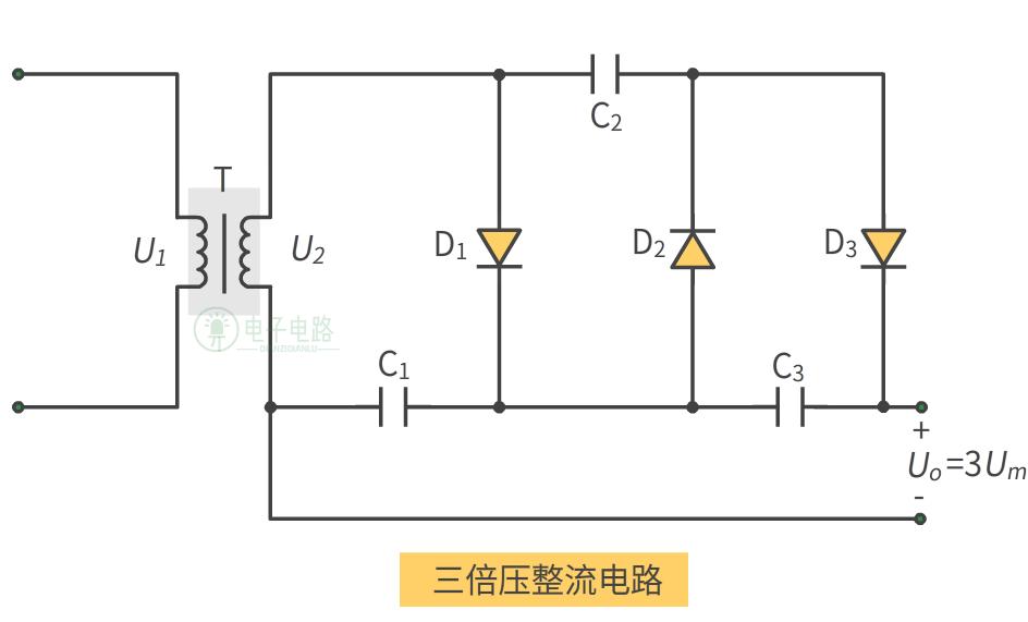 這就實(shí)現(xiàn)了兩倍電壓的輸出了,需要注意的是,如果考慮到二極管的管壓降,或者在交流電輸入頻率太低時(shí)通過電容會有一定阻抗情況下,電路輸出電壓會比理想中的電壓要小。如果在上圖的二倍壓整流電流的基礎(chǔ)上再增加二極管和電容器,就可以實(shí)現(xiàn)輸出電壓的增加,比如增加多一個(gè)二極管和電容器,就變成了三倍壓整流電路。