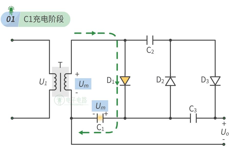 為方便分析,把變壓器輸出的電壓分成正半周和負(fù)半周進(jìn)行分析,這里把變壓器輸出電壓的峰值電壓記為Um,不考慮二極管導(dǎo)通壓降的情況下,在交流電正半周到來時(shí),C1充滿電后兩端電壓為Um。如下圖所示:
