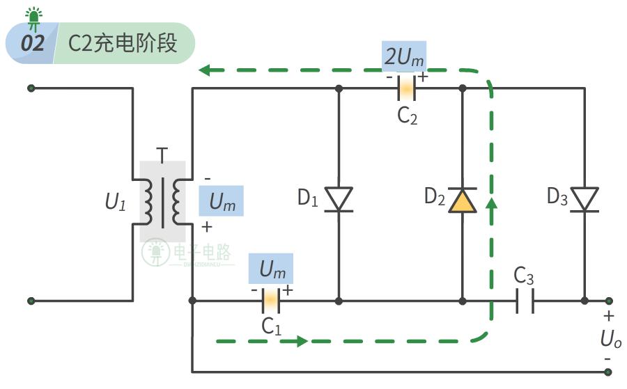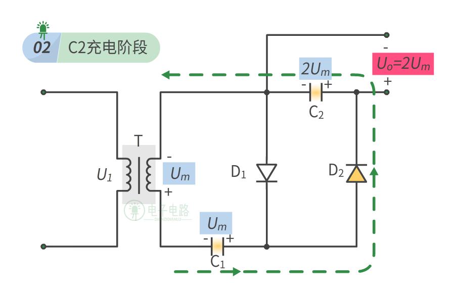 而在負(fù)半周時(shí),變壓器電壓與電容C1電壓疊加起來給C2進(jìn)行充電,C2充滿電后兩端電壓為2Um。如下圖所示: