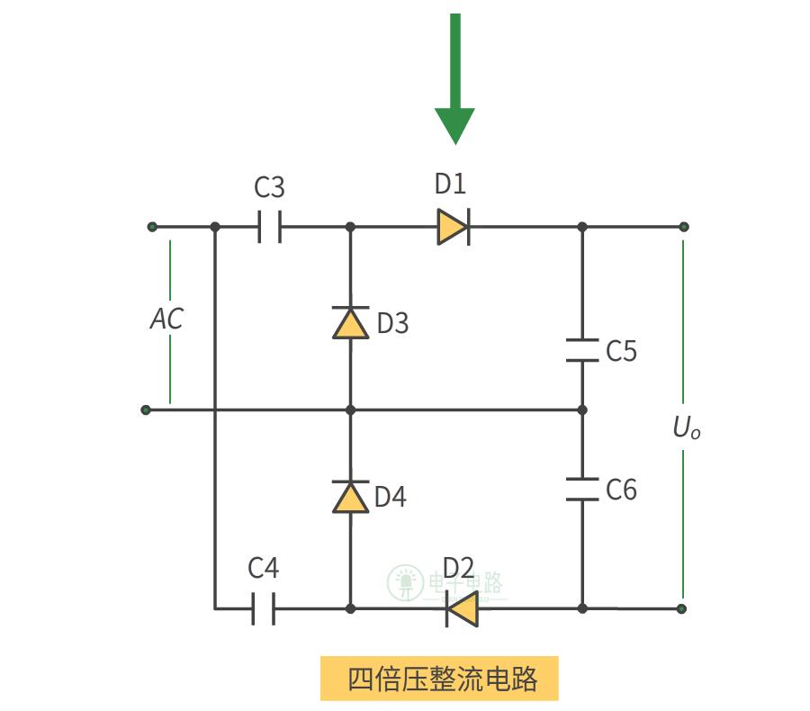 這樣一來,輸出電壓UO實(shí)際為電容C5與C6的電壓相互疊加的結(jié)果,所以輸出電壓為4Um,這是一個(gè)四倍壓整流電路。如果把上圖的電路捋一捋,擺整齊一點(diǎn),電路圖實(shí)際是下圖這樣的: