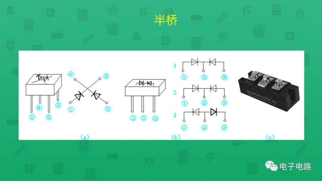 半橋是將四個二極管橋式整流的一半封在一起,用兩個半橋可組成一個橋式整流電路,一個半橋也可以組成變壓器帶中心抽頭的全波整流電路, 選擇整流橋要考慮整流電路和工作電壓。