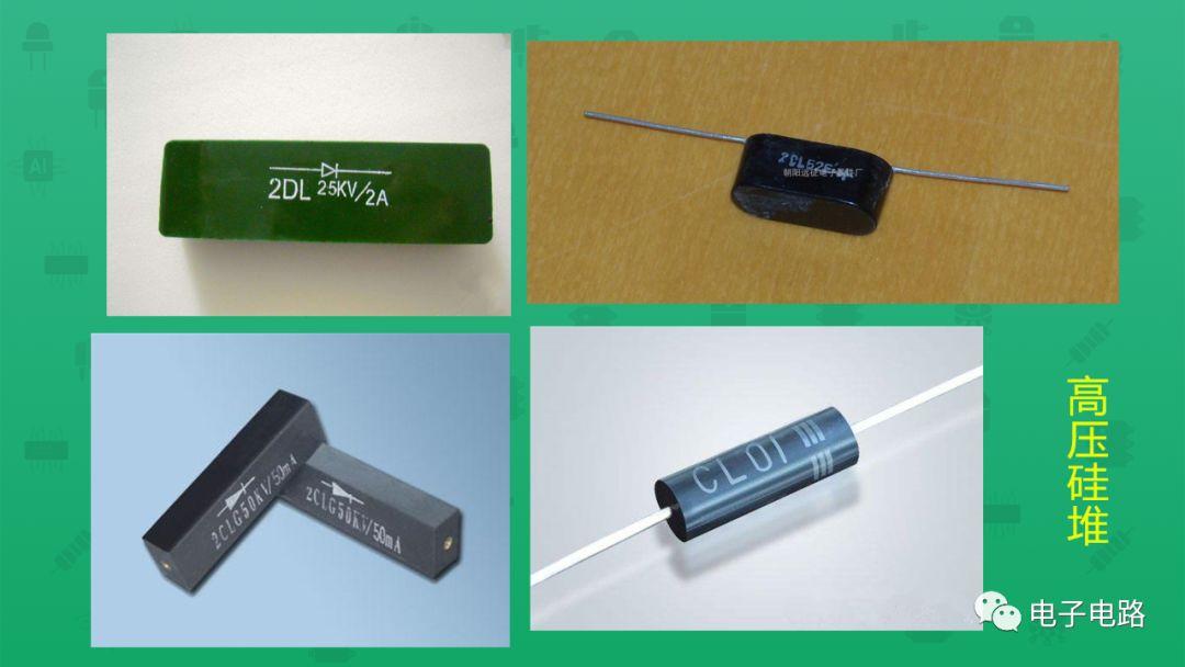 02【高壓硅堆】高壓硅堆又叫硅柱。它是一種硅高頻高壓整流二極管。工作電壓在幾千伏至幾萬伏之間。常用于黑白電視機或其他電子儀器中作高頻高壓整流。它之所以能有如此高的耐壓本領(lǐng),是因為它的內(nèi)部是由若干個硅高頻二極管的管心串聯(lián)起來組合而成的。外面用高頻陶瓷進行封裝。