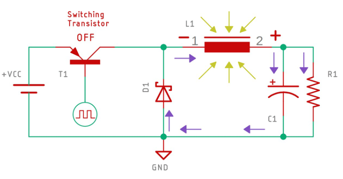 當(dāng)晶體管處于關(guān)斷狀態(tài)時,存儲在電感L1中的能量坍塌并流過二極管D1,如圖中箭頭所示。在這種情況下,電感兩端的電壓處于反極性,因此二極管處于正偏置狀態(tài)?,F(xiàn)在,由于電感器的磁場坍塌,電流繼續(xù)流過負(fù)載,直到電感器耗盡電荷。所有這些都發(fā)生在晶體管處于關(guān)閉狀態(tài)時。