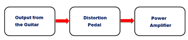 失真踏板在音符上產(chǎn)生失真的聲音。一般來(lái)說(shuō),在吉他音源和功率放大器之間使用失真踏板電路。一個(gè)簡(jiǎn)單的帶有失真電路的吉他框圖如下所示。