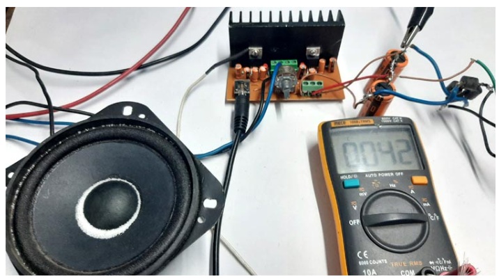 此外,您可以看到在測試期間室溫為31°C。此時放大器處于關(guān)斷狀態(tài),萬用表顯示的只是室溫。在測試的時候,我在低音炮的錐體中添加了一些鹽來顯示低音,它在這個電路中產(chǎn)生的低音會很低,因為我沒有使用音調(diào)控制電路來增強低音。我將在下一篇文章中做這個。