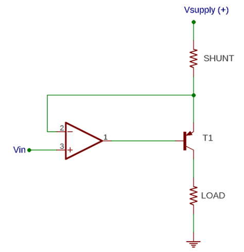 對(duì)于電流匯聚電路,運(yùn)算放大器的連接被改變,即負(fù)輸入被連接到一個(gè)分流電阻。這將為運(yùn)算放大器提供必要的負(fù)反饋。然后我們有一個(gè)PNP晶體管,它連接在運(yùn)放輸出端,這樣運(yùn)放輸出引腳就可以驅(qū)動(dòng)PNP晶體管。現(xiàn)在,請(qǐng)始終記住,運(yùn)算放大器將嘗試使兩個(gè)輸入端的電壓(正極和負(fù)極)相等。