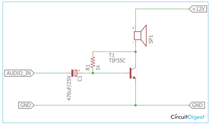 電阻器R1用作基極電阻器,它提供足夠的基極電流以驅動晶體管達到飽和點。470uF電容器C1是電路的重要組成部分。這是因為電容器服務于兩個目的。首先,電容將基極與輸入電源隔離,使基極電壓或電流不會影響音頻源,另一個目的是充當輸入源的直流阻塞電容。電容器阻擋直流,只通過交流。這是由470uF電容器有效地服務,它只允許交流頻率通過。