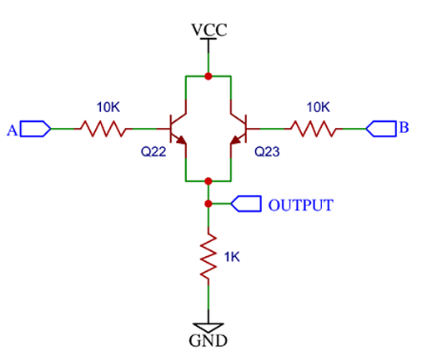第一個版本的OR門是最簡單的一個-它由兩個并聯(lián)的發(fā)射極跟隨器共享一個共同的發(fā)射極電阻。