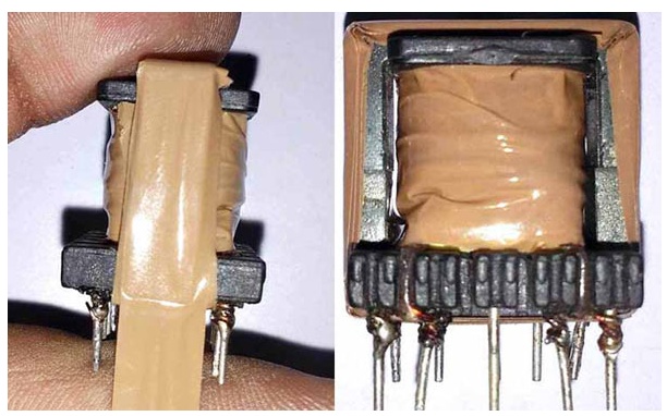 第四步:現(xiàn)在我們可以用管道膠帶牢牢地固定兩個(gè)核心。完成后,完成的變壓器應(yīng)該如下所示。